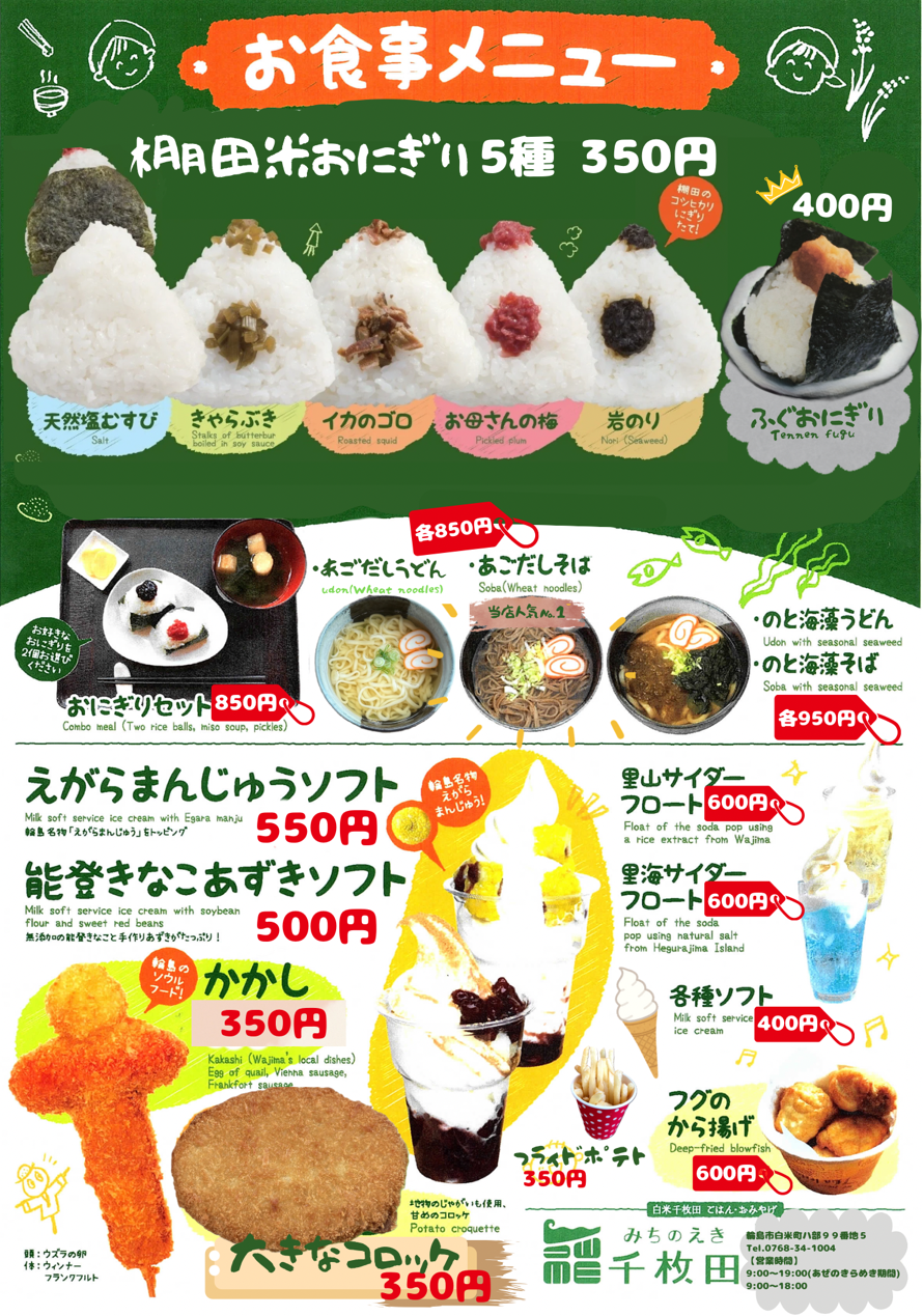 道の駅千枚田ポケットパーク内にあるレストランには地元農家さんで丹精込めて作られたお米のおにぎりを始め、トビウオのお出しが絶品のあごだしうどん、そばがあります。また、揚げ物も充実しており、全国で水揚げ量№1のふぐを使った唐揚、輪島のソールフードでもあるかかし、ハート型のコロッケ、フライドポテトなど一押しのメニユーが揃っています。店内には飲食スペースも設けてあり、約33席(チャイルドチェア2席あり)使用可能となっております。地元の朝採れ野菜などの販売もしており、地物を使った土産物やお菓子等海の幸・山の幸も豊富に揃っています。ソフトクリームやかき氷、アイスコーヒーなどの冷たいデザート系も充実しています(o^―^o)