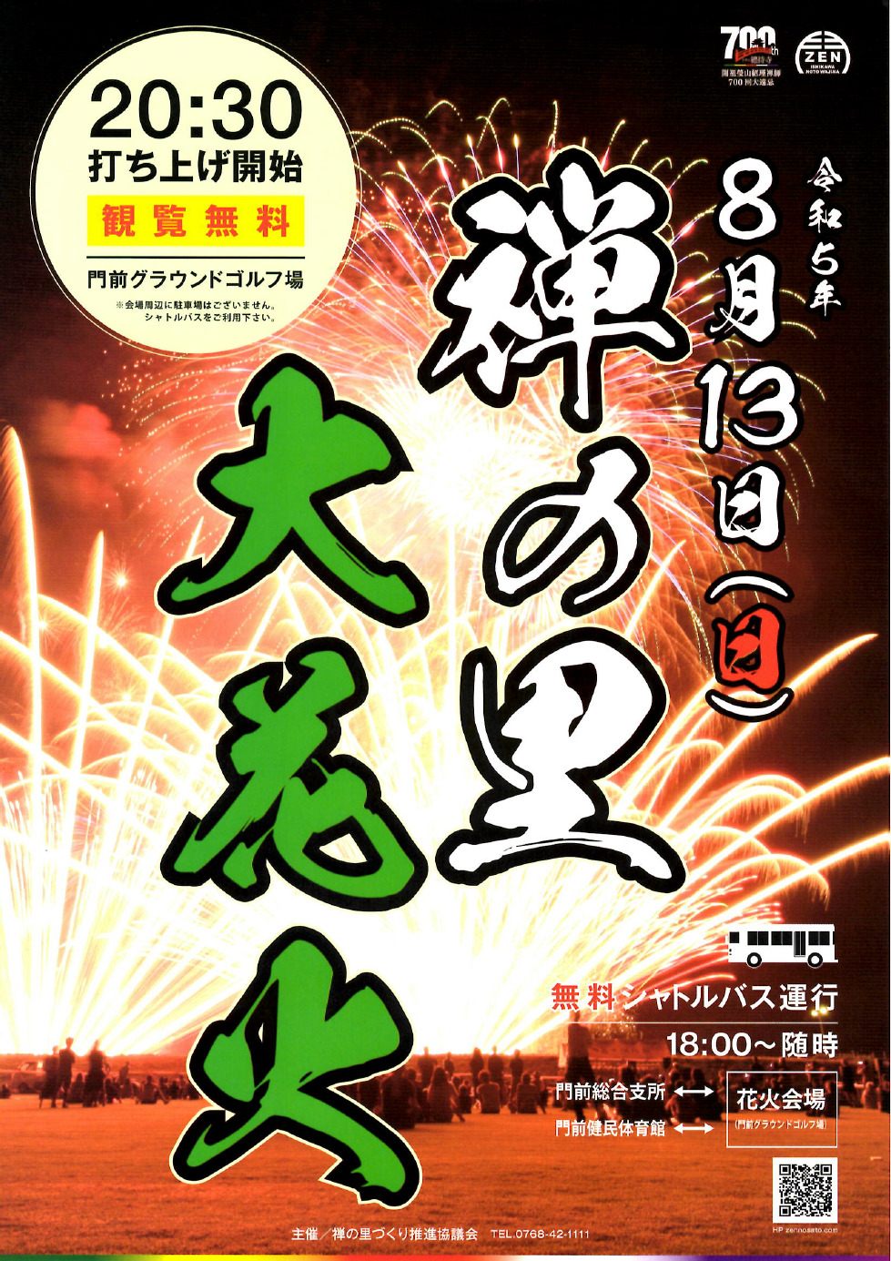 ○無料シャトルバス運行 18:00〜随時 ・門前総合支所⇔花火会場(門前グランドゴルフ場) ・門前健民体育館⇔花火会場(門前グランドゴルフ場)