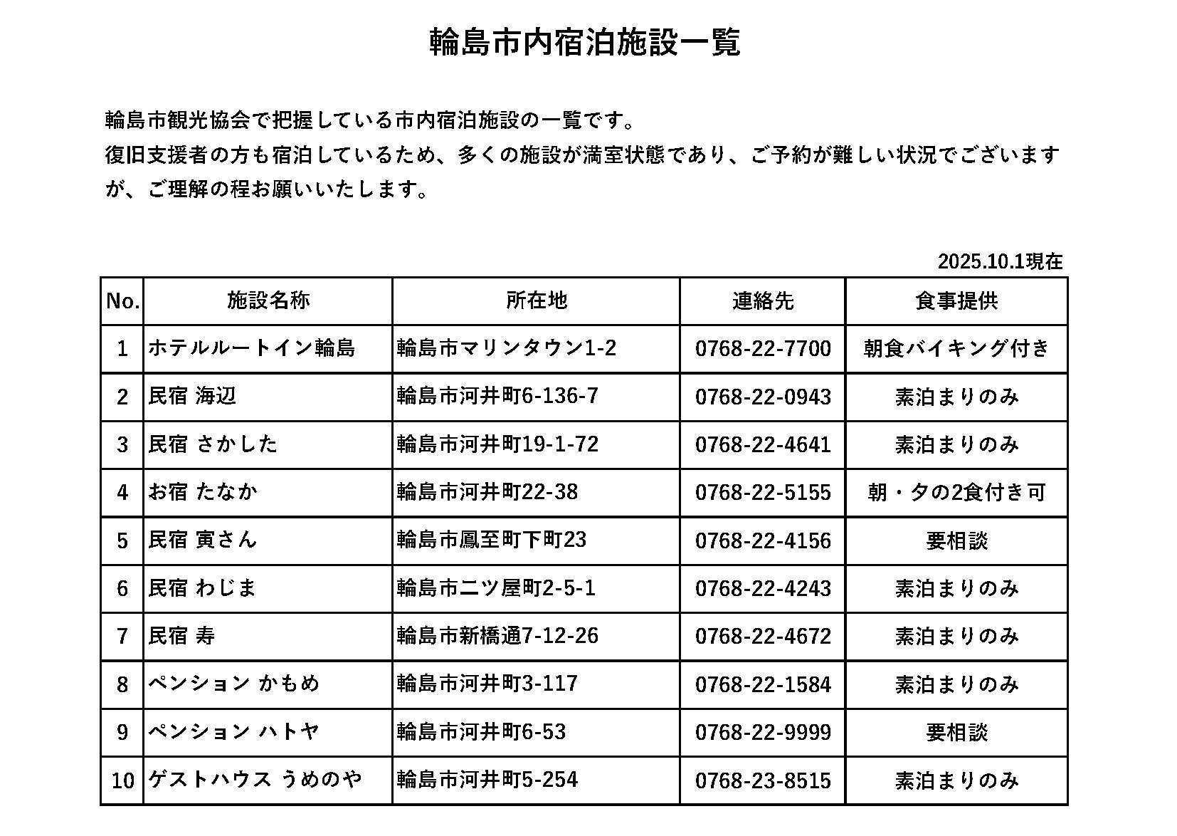 住所輪島市河井町6-53チェックイン/チェックアウトチェックイン15:00/チェックアウト10:0客室数7室料金素泊まり 3,850円~(税込)2食付き 11,000円~(税込)クレジッ…